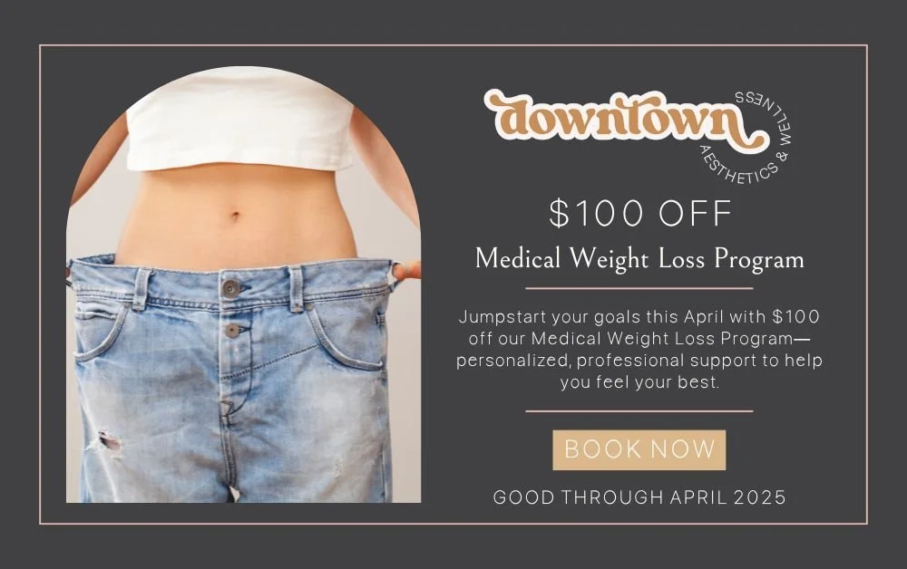 Jumpstart your goals this April with $100 off our Medical Weight Loss Program with personalized, professional support to help you feel your best.